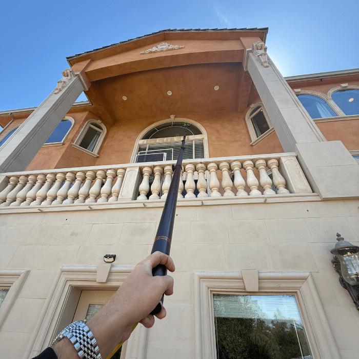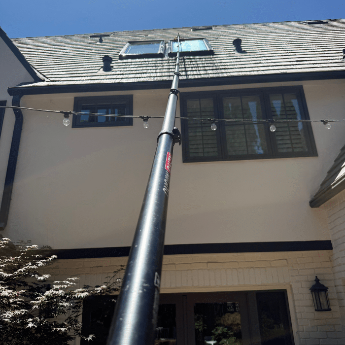 The last phase of the window washing process is the window washing itself! We will use water-fed poles and filtered water to reinvigorate those glass panes. They will sparkle and shine in no time!